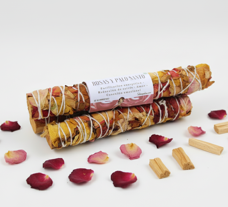 Atado elaborado de forma 100% artesanal, combina las propiedades purificadoras del Palo Santo (dulce y amaderado) con el poder de las Rosas (aroma floral). Ideal para rituales de bendición del hogar, crea atmosferas de amor y energías positivas.